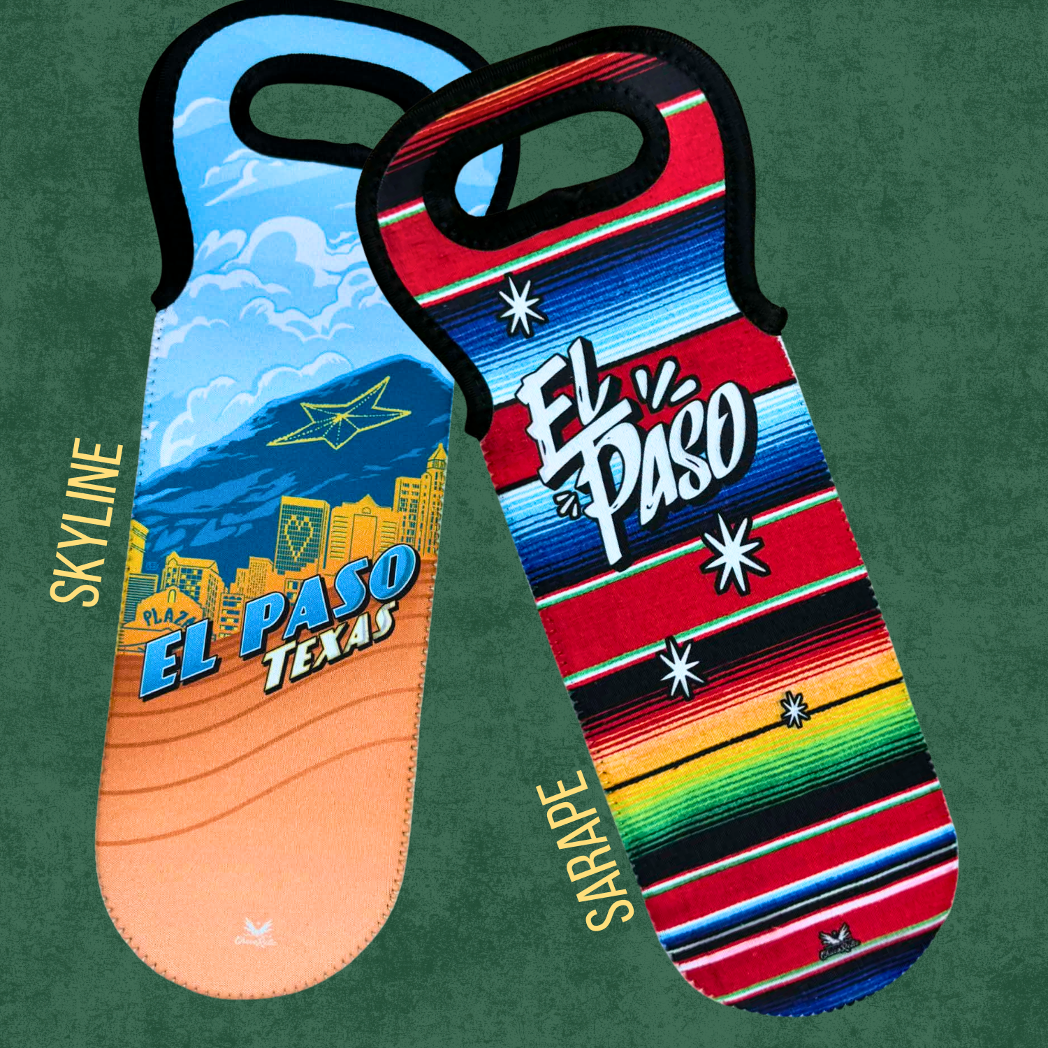 Keep your wine at the perfect temperature with our neoprene wine coolers, while representing El Paso's vibrant spirit!
